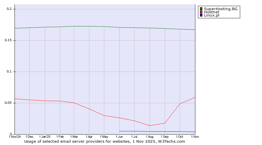 TechnologiesContent ManagementServer-side Languages Client-side Languages JavaScript Libraries CSS Frameworks Web Servers Web Panels Operating Systems Web Hosting Data Centers Reverse Proxies DNS Servers Email Servers SSL Certificate Authorities Content Delivery Traffic Analysis Tools Advertising Networks Tag Managers Social Widgets Site Elements Structured Data Markup Languages Character Encodings Image File Formats Top Level Domains Server Locations Content Languages | Technologies > Email Servers > Technology usage comparison Comparison of the usage statistics of SuperHosting.BG vs. Hostnet vs. Linux.pl for websitesThis report shows the usage statistics of SuperHosting.BG vs. Hostnet vs. Linux.pl as email server provider on the web. See technologies overview for explanations on the methodologies used in the surveys. Our reports are updated daily. UsageThis diagram shows the percentages of websites using the selected technologies. How to read the diagram: