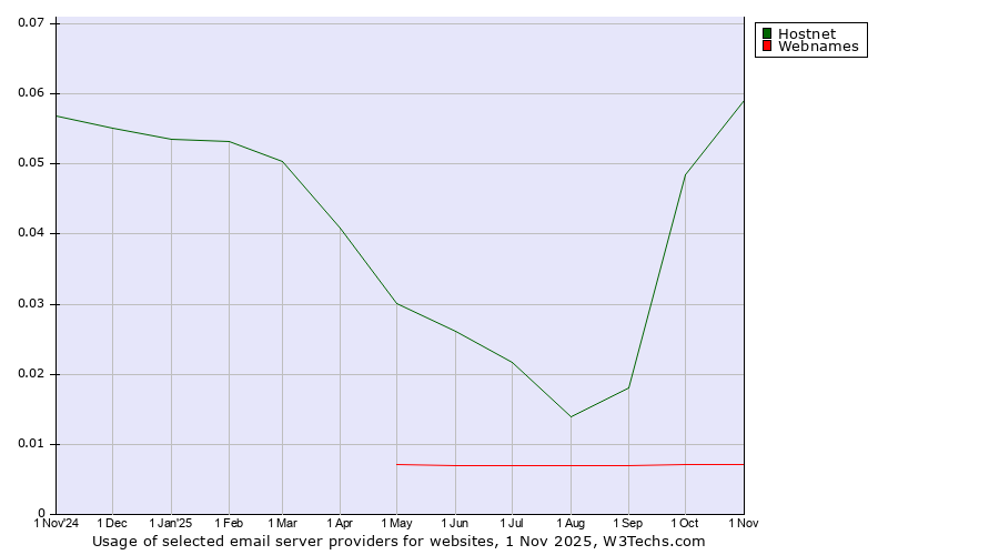 TechnologiesContent ManagementServer-side Languages Client-side Languages JavaScript Libraries CSS Frameworks Web Servers Web Panels Operating Systems Web Hosting Data Centers Reverse Proxies DNS Servers Email Servers SSL Certificate Authorities Content Delivery Traffic Analysis Tools Advertising Networks Tag Managers Social Widgets Site Elements Structured Data Markup Languages Character Encodings Image File Formats Top Level Domains Server Locations Content Languages ComparisonCompare with other | Technologies > Email Servers > Technology usage comparison Comparison of the usage statistics of Hostnet vs. Webnames for websitesThis report shows the usage statistics of Hostnet vs. Webnames as email server provider on the web. See technologies overview for explanations on the methodologies used in the surveys. Our reports are updated daily. UsageThis diagram shows the percentages of websites using the selected technologies. How to read the diagram: