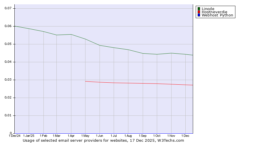TechnologiesContent ManagementServer-side Languages Client-side Languages JavaScript Libraries CSS Frameworks Web Servers Web Panels Operating Systems Web Hosting Data Centers Reverse Proxies DNS Servers Email Servers SSL Certificate Authorities Content Delivery Traffic Analysis Tools Advertising Networks Tag Managers Social Widgets Site Elements Structured Data Markup Languages Character Encodings Image File Formats Top Level Domains Server Locations Content Languages | Technologies > Email Servers > Technology usage comparison Comparison of the usage statistics of Linode vs. Hostneverdie vs. Webhost Python for websitesThis report shows the usage statistics of Linode vs. Hostneverdie vs. Webhost Python as email server provider on the web. See technologies overview for explanations on the methodologies used in the surveys. Our reports are updated daily. UsageThis diagram shows the percentages of websites using the selected technologies. How to read the diagram: