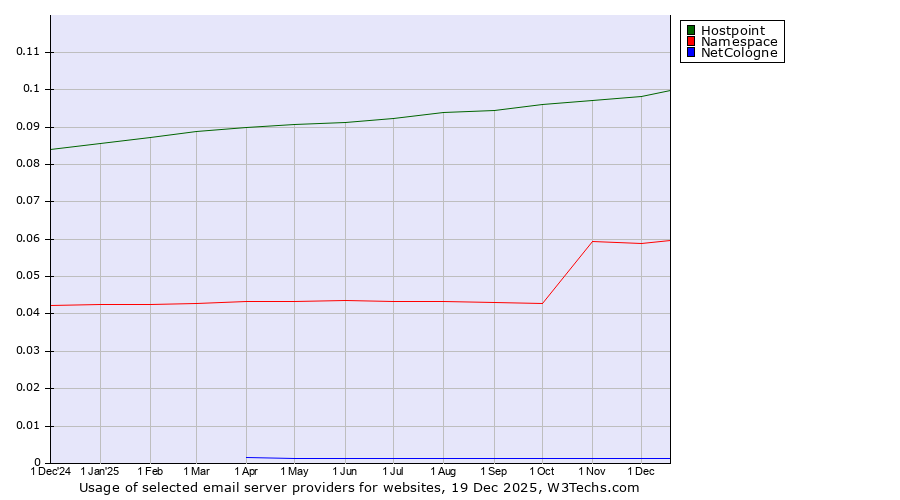 TechnologiesContent ManagementServer-side Languages Client-side Languages JavaScript Libraries CSS Frameworks Web Servers Web Panels Operating Systems Web Hosting Data Centers Reverse Proxies DNS Servers Email Servers SSL Certificate Authorities Content Delivery Traffic Analysis Tools Advertising Networks Tag Managers Social Widgets Site Elements Structured Data Markup Languages Character Encodings Image File Formats Top Level Domains Server Locations Content Languages | Technologies > Email Servers > Technology usage comparison Comparison of the usage statistics of Hostpoint vs. Namespace vs. NetCologne for websitesThis report shows the usage statistics of Hostpoint vs. Namespace vs. NetCologne as email server provider on the web. See technologies overview for explanations on the methodologies used in the surveys. Our reports are updated daily. UsageThis diagram shows the percentages of websites using the selected technologies. How to read the diagram: