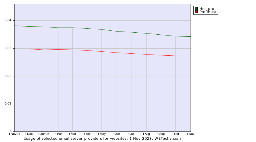 TechnologiesContent ManagementServer-side Languages Client-side Languages JavaScript Libraries CSS Frameworks Web Servers Web Panels Operating Systems Web Hosting Data Centers Reverse Proxies DNS Servers Email Servers SSL Certificate Authorities Content Delivery Traffic Analysis Tools Advertising Networks Tag Managers Social Widgets Site Elements Structured Data Markup Languages Character Encodings Image File Formats Top Level Domains Server Locations Content Languages ComparisonCompare with other | Technologies > Email Servers > Technology usage comparison Comparison of the usage statistics of Hostpro vs. Profihost for websitesThis report shows the usage statistics of Hostpro vs. Profihost as email server provider on the web. See technologies overview for explanations on the methodologies used in the surveys. Our reports are updated daily. UsageThis diagram shows the percentages of websites using the selected technologies. How to read the diagram:
