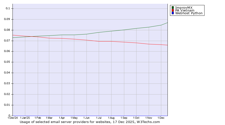 TechnologiesContent ManagementServer-side Languages Client-side Languages JavaScript Libraries CSS Frameworks Web Servers Web Panels Operating Systems Web Hosting Data Centers Reverse Proxies DNS Servers Email Servers SSL Certificate Authorities Content Delivery Traffic Analysis Tools Advertising Networks Tag Managers Social Widgets Site Elements Structured Data Markup Languages Character Encodings Image File Formats Top Level Domains Server Locations Content Languages | Technologies > Email Servers > Technology usage comparison Comparison of the usage statistics of ImprovMX vs. PA Vietnam vs. Webhost Python for websitesThis report shows the usage statistics of ImprovMX vs. PA Vietnam vs. Webhost Python as email server provider on the web. See technologies overview for explanations on the methodologies used in the surveys. Our reports are updated daily. UsageThis diagram shows the percentages of websites using the selected technologies. How to read the diagram: