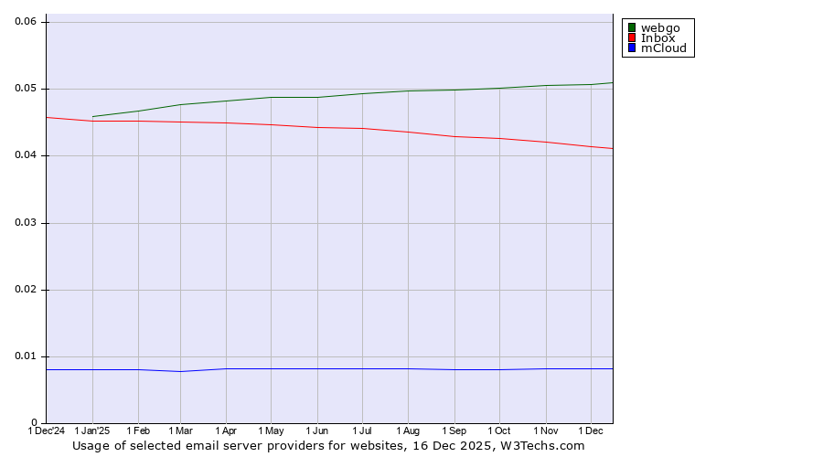 TechnologiesContent ManagementServer-side Languages Client-side Languages JavaScript Libraries CSS Frameworks Web Servers Web Panels Operating Systems Web Hosting Data Centers Reverse Proxies DNS Servers Email Servers SSL Certificate Authorities Content Delivery Traffic Analysis Tools Advertising Networks Tag Managers Social Widgets Site Elements Structured Data Markup Languages Character Encodings Image File Formats Top Level Domains Server Locations Content Languages | Technologies > Email Servers > Technology usage comparison Comparison of the usage statistics of webgo vs. Inbox vs. mCloud for websitesThis report shows the usage statistics of webgo vs. Inbox vs. mCloud as email server provider on the web. See technologies overview for explanations on the methodologies used in the surveys. Our reports are updated daily. UsageThis diagram shows the percentages of websites using the selected technologies. How to read the diagram: