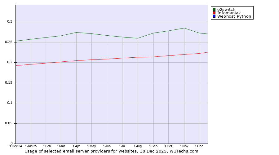 TechnologiesContent ManagementServer-side Languages Client-side Languages JavaScript Libraries CSS Frameworks Web Servers Web Panels Operating Systems Web Hosting Data Centers Reverse Proxies DNS Servers Email Servers SSL Certificate Authorities Content Delivery Traffic Analysis Tools Advertising Networks Tag Managers Social Widgets Site Elements Structured Data Markup Languages Character Encodings Image File Formats Top Level Domains Server Locations Content Languages | Technologies > Email Servers > Technology usage comparison Comparison of the usage statistics of o2switch vs. Infomaniak vs. Webhost Python for websitesThis report shows the usage statistics of o2switch vs. Infomaniak vs. Webhost Python as email server provider on the web. See technologies overview for explanations on the methodologies used in the surveys. Our reports are updated daily. UsageThis diagram shows the percentages of websites using the selected technologies. How to read the diagram: