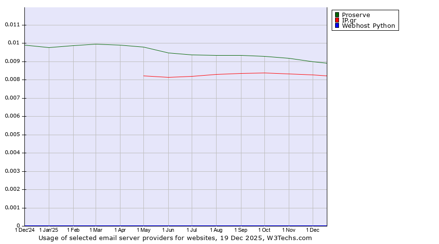TechnologiesContent ManagementServer-side Languages Client-side Languages JavaScript Libraries CSS Frameworks Web Servers Web Panels Operating Systems Web Hosting Data Centers Reverse Proxies DNS Servers Email Servers SSL Certificate Authorities Content Delivery Traffic Analysis Tools Advertising Networks Tag Managers Social Widgets Site Elements Structured Data Markup Languages Character Encodings Image File Formats Top Level Domains Server Locations Content Languages | Technologies > Email Servers > Technology usage comparison Comparison of the usage statistics of Proserve vs. IP.gr vs. Webhost Python for websitesThis report shows the usage statistics of Proserve vs. IP.gr vs. Webhost Python as email server provider on the web. See technologies overview for explanations on the methodologies used in the surveys. Our reports are updated daily. UsageThis diagram shows the percentages of websites using the selected technologies. How to read the diagram: