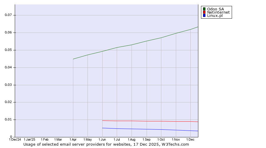 TechnologiesContent ManagementServer-side Languages Client-side Languages JavaScript Libraries CSS Frameworks Web Servers Web Panels Operating Systems Web Hosting Data Centers Reverse Proxies DNS Servers Email Servers SSL Certificate Authorities Content Delivery Traffic Analysis Tools Advertising Networks Tag Managers Social Widgets Site Elements Structured Data Markup Languages Character Encodings Image File Formats Top Level Domains Server Locations Content Languages | Technologies > Email Servers > Technology usage comparison Comparison of the usage statistics of Odoo SA vs. Netinternet vs. Linux.pl for websitesThis report shows the usage statistics of Odoo SA vs. Netinternet vs. Linux.pl as email server provider on the web. See technologies overview for explanations on the methodologies used in the surveys. Our reports are updated daily. UsageThis diagram shows the percentages of websites using the selected technologies. How to read the diagram:
