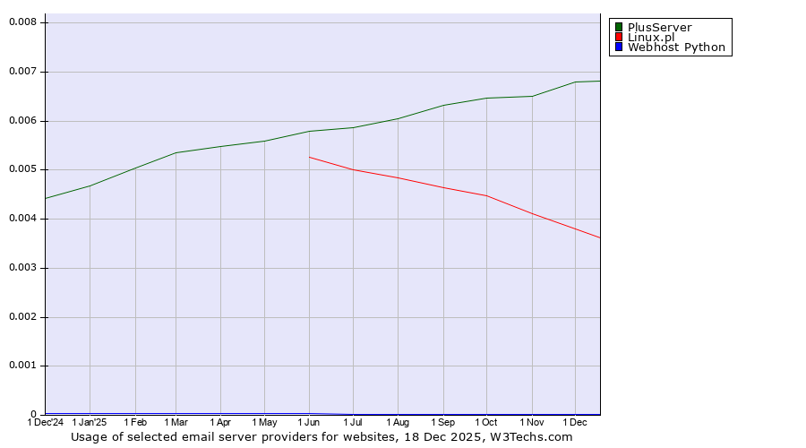 TechnologiesContent ManagementServer-side Languages Client-side Languages JavaScript Libraries CSS Frameworks Web Servers Web Panels Operating Systems Web Hosting Data Centers Reverse Proxies DNS Servers Email Servers SSL Certificate Authorities Content Delivery Traffic Analysis Tools Advertising Networks Tag Managers Social Widgets Site Elements Structured Data Markup Languages Character Encodings Image File Formats Top Level Domains Server Locations Content Languages | Technologies > Email Servers > Technology usage comparison Comparison of the usage statistics of PlusServer vs. Linux.pl vs. Webhost Python for websitesThis report shows the usage statistics of PlusServer vs. Linux.pl vs. Webhost Python as email server provider on the web. See technologies overview for explanations on the methodologies used in the surveys. Our reports are updated daily. UsageThis diagram shows the percentages of websites using the selected technologies. How to read the diagram:
