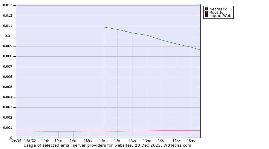 TechnologiesContent ManagementServer-side Languages Client-side Languages JavaScript Libraries CSS Frameworks Web Servers Web Panels Operating Systems Web Hosting Data Centers Reverse Proxies DNS Servers Email Servers SSL Certificate Authorities Content Delivery Traffic Analysis Tools Advertising Networks Tag Managers Social Widgets Site Elements Structured Data Markup Languages Character Encodings Image File Formats Top Level Domains Server Locations Content Languages | Technologies > Email Servers > Technology usage comparison Comparison of the usage statistics of Netmark vs. Root.lu vs. Liquid Web for websitesThis report shows the usage statistics of Netmark vs. Root.lu vs. Liquid Web as email server provider on the web. See technologies overview for explanations on the methodologies used in the surveys. Our reports are updated daily. UsageThis diagram shows the percentages of websites using the selected technologies. How to read the diagram: