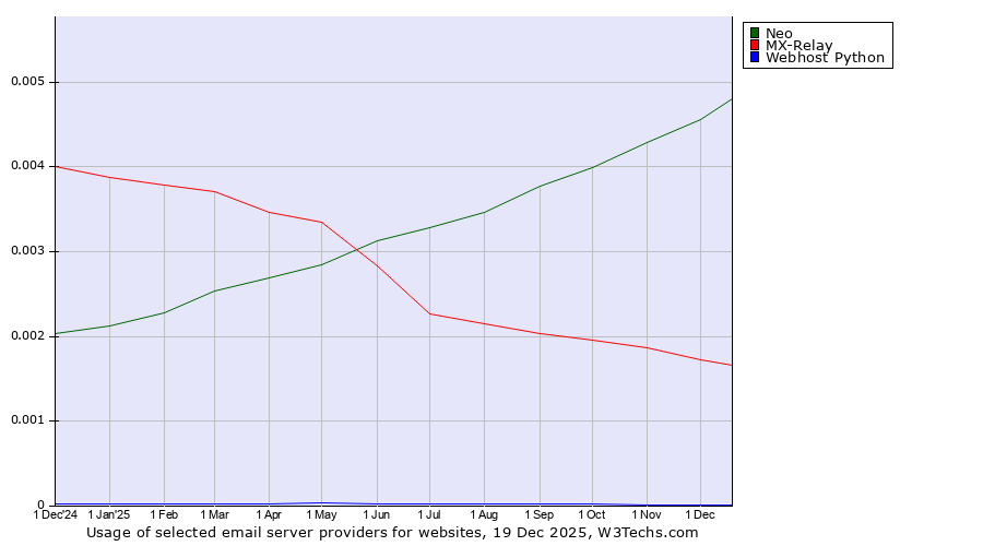 TechnologiesContent ManagementServer-side Languages Client-side Languages JavaScript Libraries CSS Frameworks Web Servers Web Panels Operating Systems Web Hosting Data Centers Reverse Proxies DNS Servers Email Servers SSL Certificate Authorities Content Delivery Traffic Analysis Tools Advertising Networks Tag Managers Social Widgets Site Elements Structured Data Markup Languages Character Encodings Image File Formats Top Level Domains Server Locations Content Languages | Technologies > Email Servers > Technology usage comparison Comparison of the usage statistics of Neo vs. MX-Relay vs. Webhost Python for websitesThis report shows the usage statistics of Neo vs. MX-Relay vs. Webhost Python as email server provider on the web. See technologies overview for explanations on the methodologies used in the surveys. Our reports are updated daily. UsageThis diagram shows the percentages of websites using the selected technologies. How to read the diagram: