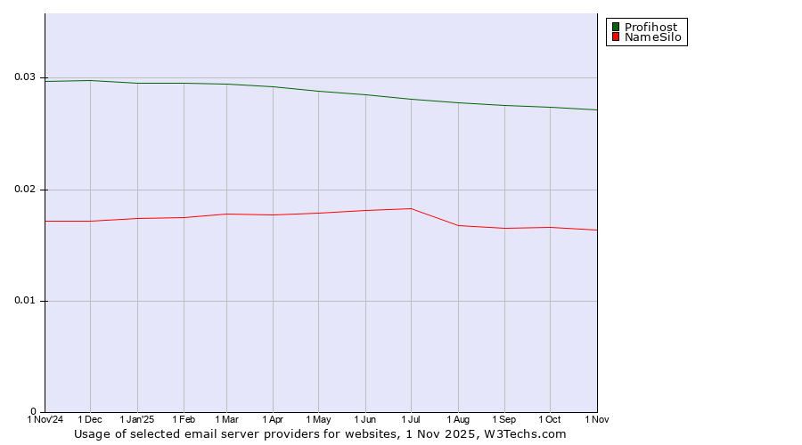 TechnologiesContent ManagementServer-side Languages Client-side Languages JavaScript Libraries CSS Frameworks Web Servers Web Panels Operating Systems Web Hosting Data Centers Reverse Proxies DNS Servers Email Servers SSL Certificate Authorities Content Delivery Traffic Analysis Tools Advertising Networks Tag Managers Social Widgets Site Elements Structured Data Markup Languages Character Encodings Image File Formats Top Level Domains Server Locations Content Languages ComparisonCompare with other | Technologies > Email Servers > Technology usage comparison Comparison of the usage statistics of Profihost vs. NameSilo for websitesThis report shows the usage statistics of Profihost vs. NameSilo as email server provider on the web. See technologies overview for explanations on the methodologies used in the surveys. Our reports are updated daily. UsageThis diagram shows the percentages of websites using the selected technologies. How to read the diagram: