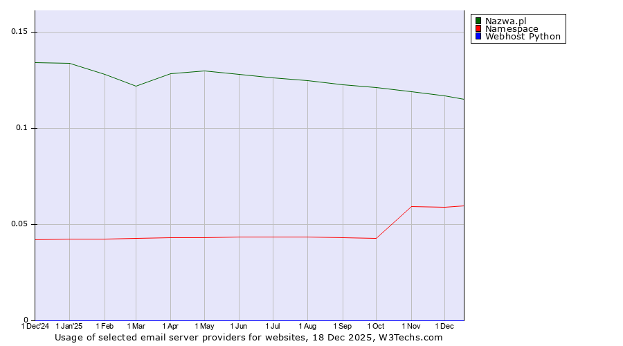TechnologiesContent ManagementServer-side Languages Client-side Languages JavaScript Libraries CSS Frameworks Web Servers Web Panels Operating Systems Web Hosting Data Centers Reverse Proxies DNS Servers Email Servers SSL Certificate Authorities Content Delivery Traffic Analysis Tools Advertising Networks Tag Managers Social Widgets Site Elements Structured Data Markup Languages Character Encodings Image File Formats Top Level Domains Server Locations Content Languages | Technologies > Email Servers > Technology usage comparison Comparison of the usage statistics of Nazwa.pl vs. Namespace vs. Webhost Python for websitesThis report shows the usage statistics of Nazwa.pl vs. Namespace vs. Webhost Python as email server provider on the web. See technologies overview for explanations on the methodologies used in the surveys. Our reports are updated daily. UsageThis diagram shows the percentages of websites using the selected technologies. How to read the diagram:
