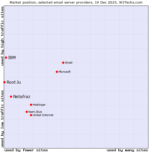 TechnologiesContent ManagementServer-side Languages Client-side Languages JavaScript Libraries CSS Frameworks Web Servers Web Panels Operating Systems Web Hosting Data Centers Reverse Proxies DNS Servers Email Servers SSL Certificate Authorities Content Delivery Traffic Analysis Tools Advertising Networks Tag Managers Social Widgets Site Elements Structured Data Markup Languages Character Encodings Image File Formats Top Level Domains Server Locations Content Languages | Technologies > Email Servers > Technology usage comparison Comparison of the usage statistics of Netafraz vs. IBM vs. Root.lu for websitesThis report shows the usage statistics of Netafraz vs. IBM vs. Root.lu as email server provider on the web. See technologies overview for explanations on the methodologies used in the surveys. Our reports are updated daily. UsageThis diagram shows the percentages of websites using the selected technologies. How to read the diagram: