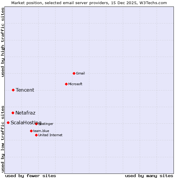 TechnologiesContent ManagementServer-side Languages Client-side Languages JavaScript Libraries CSS Frameworks Web Servers Web Panels Operating Systems Web Hosting Data Centers Reverse Proxies DNS Servers Email Servers SSL Certificate Authorities Content Delivery Traffic Analysis Tools Advertising Networks Tag Managers Social Widgets Site Elements Structured Data Markup Languages Character Encodings Image File Formats Top Level Domains Server Locations Content Languages | Technologies > Email Servers > Technology usage comparison Comparison of the usage statistics of Tencent vs. Netafraz vs. ScalaHosting for websitesThis report shows the usage statistics of Tencent vs. Netafraz vs. ScalaHosting as email server provider on the web. See technologies overview for explanations on the methodologies used in the surveys. Our reports are updated daily. UsageThis diagram shows the percentages of websites using the selected technologies. How to read the diagram: