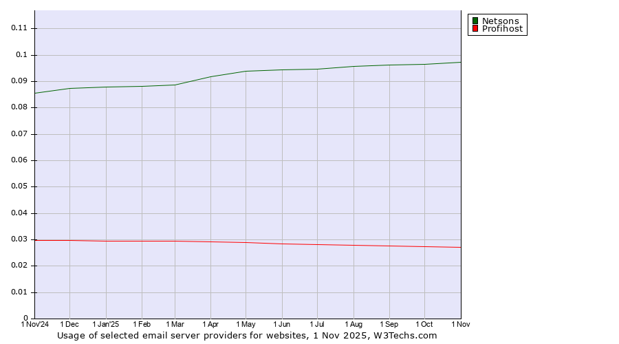 TechnologiesContent ManagementServer-side Languages Client-side Languages JavaScript Libraries CSS Frameworks Web Servers Web Panels Operating Systems Web Hosting Data Centers Reverse Proxies DNS Servers Email Servers SSL Certificate Authorities Content Delivery Traffic Analysis Tools Advertising Networks Tag Managers Social Widgets Site Elements Structured Data Markup Languages Character Encodings Image File Formats Top Level Domains Server Locations Content Languages ComparisonCompare with other | Technologies > Email Servers > Technology usage comparison Comparison of the usage statistics of Netsons vs. Profihost for websitesThis report shows the usage statistics of Netsons vs. Profihost as email server provider on the web. See technologies overview for explanations on the methodologies used in the surveys. Our reports are updated daily. UsageThis diagram shows the percentages of websites using the selected technologies. How to read the diagram: