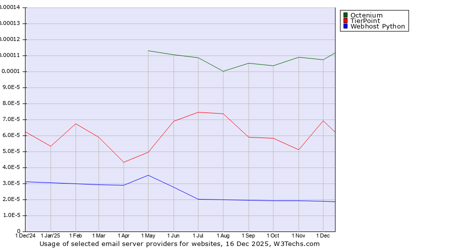 TechnologiesContent ManagementServer-side Languages Client-side Languages JavaScript Libraries CSS Frameworks Web Servers Web Panels Operating Systems Web Hosting Data Centers Reverse Proxies DNS Servers Email Servers SSL Certificate Authorities Content Delivery Traffic Analysis Tools Advertising Networks Tag Managers Social Widgets Site Elements Structured Data Markup Languages Character Encodings Image File Formats Top Level Domains Server Locations Content Languages | Technologies > Email Servers > Technology usage comparison Comparison of the usage statistics of Octenium vs. TierPoint vs. Webhost Python for websitesThis report shows the usage statistics of Octenium vs. TierPoint vs. Webhost Python as email server provider on the web. See technologies overview for explanations on the methodologies used in the surveys. Our reports are updated daily. UsageThis diagram shows the percentages of websites using the selected technologies. How to read the diagram: