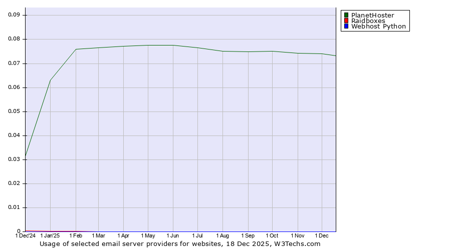 TechnologiesContent ManagementServer-side Languages Client-side Languages JavaScript Libraries CSS Frameworks Web Servers Web Panels Operating Systems Web Hosting Data Centers Reverse Proxies DNS Servers Email Servers SSL Certificate Authorities Content Delivery Traffic Analysis Tools Advertising Networks Tag Managers Social Widgets Site Elements Structured Data Markup Languages Character Encodings Image File Formats Top Level Domains Server Locations Content Languages | Technologies > Email Servers > Technology usage comparison Comparison of the usage statistics of PlanetHoster vs. Raidboxes vs. Webhost Python for websitesThis report shows the usage statistics of PlanetHoster vs. Raidboxes vs. Webhost Python as email server provider on the web. See technologies overview for explanations on the methodologies used in the surveys. Our reports are updated daily. UsageThis diagram shows the percentages of websites using the selected technologies. How to read the diagram: