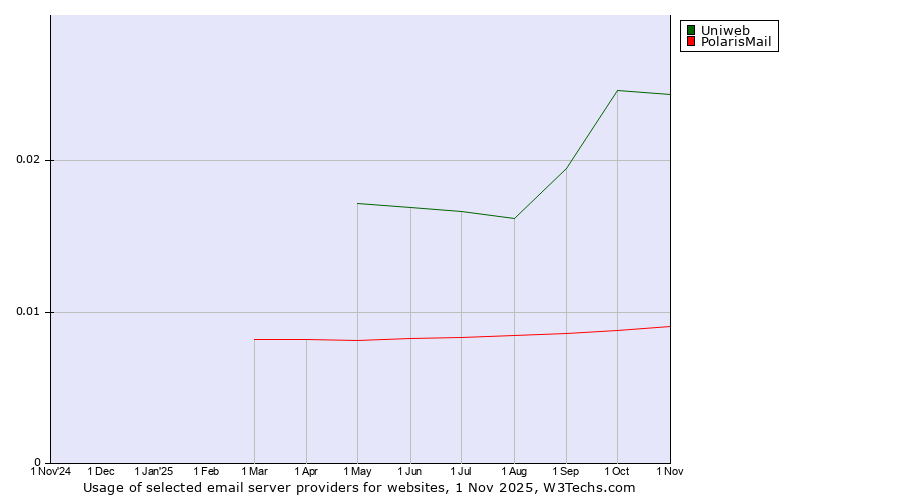 TechnologiesContent ManagementServer-side Languages Client-side Languages JavaScript Libraries CSS Frameworks Web Servers Web Panels Operating Systems Web Hosting Data Centers Reverse Proxies DNS Servers Email Servers SSL Certificate Authorities Content Delivery Traffic Analysis Tools Advertising Networks Tag Managers Social Widgets Site Elements Structured Data Markup Languages Character Encodings Image File Formats Top Level Domains Server Locations Content Languages ComparisonCompare with other | Technologies > Email Servers > Technology usage comparison Comparison of the usage statistics of Uniweb vs. PolarisMail for websitesThis report shows the usage statistics of Uniweb vs. PolarisMail as email server provider on the web. See technologies overview for explanations on the methodologies used in the surveys. Our reports are updated daily. UsageThis diagram shows the percentages of websites using the selected technologies. How to read the diagram: