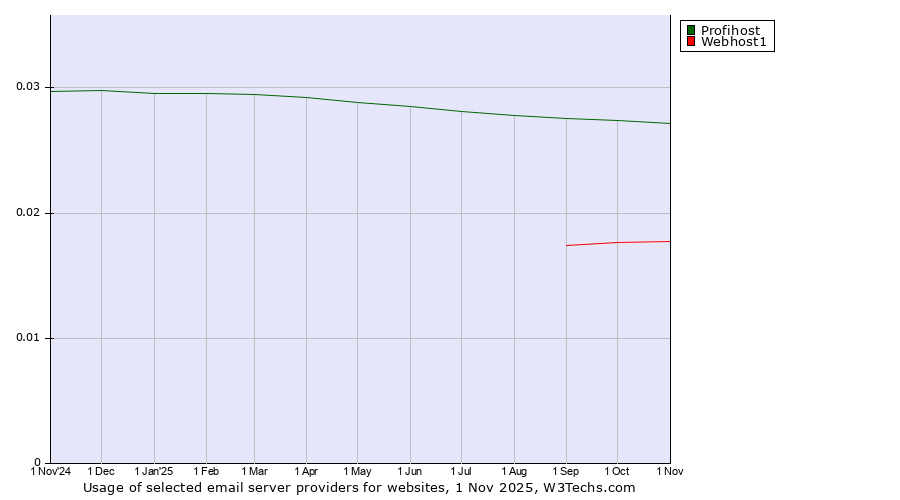 TechnologiesContent ManagementServer-side Languages Client-side Languages JavaScript Libraries CSS Frameworks Web Servers Web Panels Operating Systems Web Hosting Data Centers Reverse Proxies DNS Servers Email Servers SSL Certificate Authorities Content Delivery Traffic Analysis Tools Advertising Networks Tag Managers Social Widgets Site Elements Structured Data Markup Languages Character Encodings Image File Formats Top Level Domains Server Locations Content Languages ComparisonCompare with other | Technologies > Email Servers > Technology usage comparison Comparison of the usage statistics of Profihost vs. Webhost1 for websitesThis report shows the usage statistics of Profihost vs. Webhost1 as email server provider on the web. See technologies overview for explanations on the methodologies used in the surveys. Our reports are updated daily. UsageThis diagram shows the percentages of websites using the selected technologies. How to read the diagram: