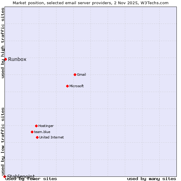 TechnologiesContent ManagementServer-side Languages Client-side Languages JavaScript Libraries CSS Frameworks Web Servers Web Panels Operating Systems Web Hosting Data Centers Reverse Proxies DNS Servers Email Servers SSL Certificate Authorities Content Delivery Traffic Analysis Tools Advertising Networks Tag Managers Social Widgets Site Elements Structured Data Markup Languages Character Encodings Image File Formats Top Level Domains Server Locations Content Languages ComparisonCompare with other | Technologies > Email Servers > Technology usage comparison Comparison of the usage statistics of Runbox vs. Stablepoint for websitesThis report shows the usage statistics of Runbox vs. Stablepoint as email server provider on the web. See technologies overview for explanations on the methodologies used in the surveys. Our reports are updated daily. UsageThis diagram shows the percentages of websites using the selected technologies. How to read the diagram: