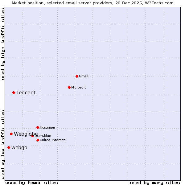 TechnologiesContent ManagementServer-side Languages Client-side Languages JavaScript Libraries CSS Frameworks Web Servers Web Panels Operating Systems Web Hosting Data Centers Reverse Proxies DNS Servers Email Servers SSL Certificate Authorities Content Delivery Traffic Analysis Tools Advertising Networks Tag Managers Social Widgets Site Elements Structured Data Markup Languages Character Encodings Image File Formats Top Level Domains Server Locations Content Languages | Technologies > Email Servers > Technology usage comparison Comparison of the usage statistics of Tencent vs. Webglobe vs. webgo for websitesThis report shows the usage statistics of Tencent vs. Webglobe vs. webgo as email server provider on the web. See technologies overview for explanations on the methodologies used in the surveys. Our reports are updated daily. UsageThis diagram shows the percentages of websites using the selected technologies. How to read the diagram: