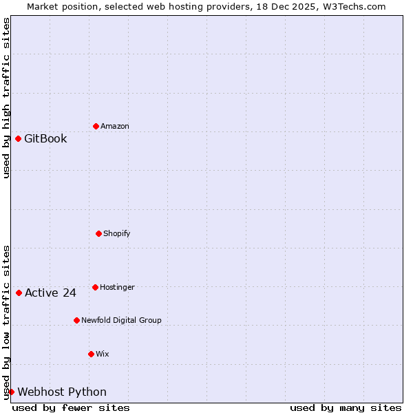 TechnologiesContent ManagementServer-side Languages Client-side Languages JavaScript Libraries CSS Frameworks Web Servers Web Panels Operating Systems Web Hosting Data Centers Reverse Proxies DNS Servers Email Servers SSL Certificate Authorities Content Delivery Traffic Analysis Tools Advertising Networks Tag Managers Social Widgets Site Elements Structured Data Markup Languages Character Encodings Image File Formats Top Level Domains Server Locations Content Languages | Technologies > Web Hosting > Technology usage comparison Comparison of the usage statistics of Active 24 vs. GitBook vs. Webhost Python for websitesThis report shows the usage statistics of Active 24 vs. GitBook vs. Webhost Python as web hosting provider on the web. See technologies overview for explanations on the methodologies used in the surveys. Our reports are updated daily. UsageThis diagram shows the percentages of websites using the selected technologies. How to read the diagram: