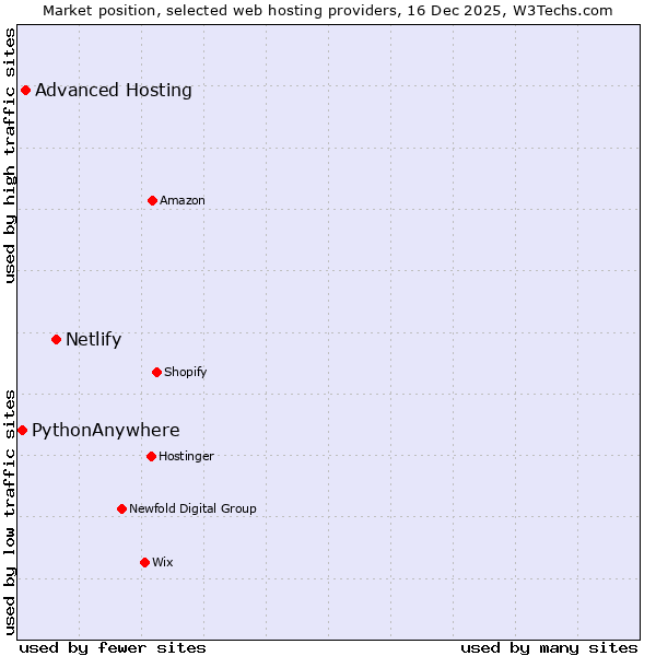 TechnologiesContent ManagementServer-side Languages Client-side Languages JavaScript Libraries CSS Frameworks Web Servers Web Panels Operating Systems Web Hosting Data Centers Reverse Proxies DNS Servers Email Servers SSL Certificate Authorities Content Delivery Traffic Analysis Tools Advertising Networks Tag Managers Social Widgets Site Elements Structured Data Markup Languages Character Encodings Image File Formats Top Level Domains Server Locations Content Languages | Technologies > Web Hosting > Technology usage comparison Comparison of the usage statistics of Netlify vs. Advanced Hosting vs. PythonAnywhere for websitesThis report shows the usage statistics of Netlify vs. Advanced Hosting vs. PythonAnywhere as web hosting provider on the web. See technologies overview for explanations on the methodologies used in the surveys. Our reports are updated daily. UsageThis diagram shows the percentages of websites using the selected technologies. How to read the diagram: