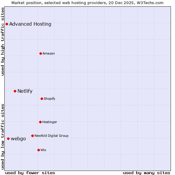 TechnologiesContent ManagementServer-side Languages Client-side Languages JavaScript Libraries CSS Frameworks Web Servers Web Panels Operating Systems Web Hosting Data Centers Reverse Proxies DNS Servers Email Servers SSL Certificate Authorities Content Delivery Traffic Analysis Tools Advertising Networks Tag Managers Social Widgets Site Elements Structured Data Markup Languages Character Encodings Image File Formats Top Level Domains Server Locations Content Languages | Technologies > Web Hosting > Technology usage comparison Comparison of the usage statistics of Netlify vs. webgo vs. Advanced Hosting for websitesThis report shows the usage statistics of Netlify vs. webgo vs. Advanced Hosting as web hosting provider on the web. See technologies overview for explanations on the methodologies used in the surveys. Our reports are updated daily. UsageThis diagram shows the percentages of websites using the selected technologies. How to read the diagram: