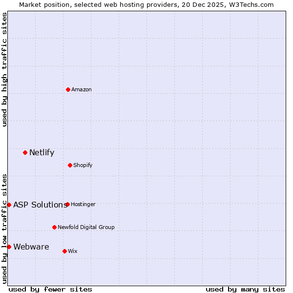 TechnologiesContent ManagementServer-side Languages Client-side Languages JavaScript Libraries CSS Frameworks Web Servers Web Panels Operating Systems Web Hosting Data Centers Reverse Proxies DNS Servers Email Servers SSL Certificate Authorities Content Delivery Traffic Analysis Tools Advertising Networks Tag Managers Social Widgets Site Elements Structured Data Markup Languages Character Encodings Image File Formats Top Level Domains Server Locations Content Languages | Technologies > Web Hosting > Technology usage comparison Comparison of the usage statistics of Netlify vs. ASP Solutions vs. Webware for websitesThis report shows the usage statistics of Netlify vs. ASP Solutions vs. Webware as web hosting provider on the web. See technologies overview for explanations on the methodologies used in the surveys. Our reports are updated daily. UsageThis diagram shows the percentages of websites using the selected technologies. How to read the diagram: