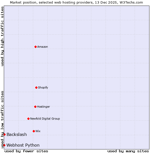 TechnologiesContent ManagementServer-side Languages Client-side Languages JavaScript Libraries CSS Frameworks Web Servers Web Panels Operating Systems Web Hosting Data Centers Reverse Proxies DNS Servers Email Servers SSL Certificate Authorities Content Delivery Traffic Analysis Tools Advertising Networks Tag Managers Social Widgets Site Elements Structured Data Markup Languages Character Encodings Image File Formats Top Level Domains Server Locations Content Languages ComparisonCompare with other | Technologies > Web Hosting > Technology usage comparison Comparison of the usage statistics of Backslash vs. Webhost Python for websitesThis report shows the usage statistics of Backslash vs. Webhost Python as web hosting provider on the web. See technologies overview for explanations on the methodologies used in the surveys. Our reports are updated daily. UsageThis diagram shows the percentages of websites using the selected technologies. How to read the diagram: