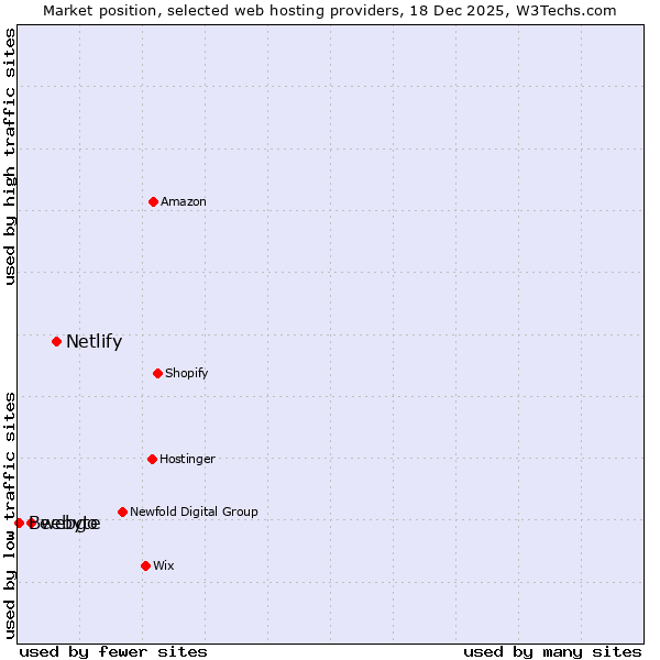 TechnologiesContent ManagementServer-side Languages Client-side Languages JavaScript Libraries CSS Frameworks Web Servers Web Panels Operating Systems Web Hosting Data Centers Reverse Proxies DNS Servers Email Servers SSL Certificate Authorities Content Delivery Traffic Analysis Tools Advertising Networks Tag Managers Social Widgets Site Elements Structured Data Markup Languages Character Encodings Image File Formats Top Level Domains Server Locations Content Languages | Technologies > Web Hosting > Technology usage comparison Comparison of the usage statistics of Netlify vs. webgo vs. Beebyte for websitesThis report shows the usage statistics of Netlify vs. webgo vs. Beebyte as web hosting provider on the web. See technologies overview for explanations on the methodologies used in the surveys. Our reports are updated daily. UsageThis diagram shows the percentages of websites using the selected technologies. How to read the diagram: