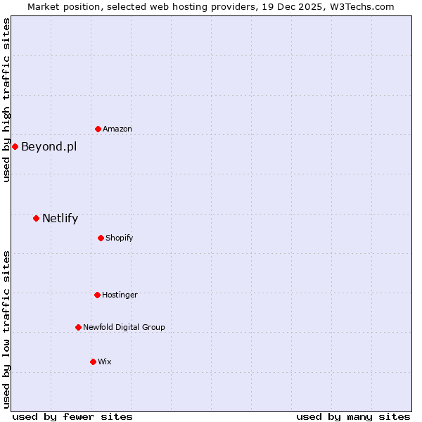 TechnologiesContent ManagementServer-side Languages Client-side Languages JavaScript Libraries CSS Frameworks Web Servers Web Panels Operating Systems Web Hosting Data Centers Reverse Proxies DNS Servers Email Servers SSL Certificate Authorities Content Delivery Traffic Analysis Tools Advertising Networks Tag Managers Social Widgets Site Elements Structured Data Markup Languages Character Encodings Image File Formats Top Level Domains Server Locations Content Languages ComparisonCompare with other | Technologies > Web Hosting > Technology usage comparison Comparison of the usage statistics of Netlify vs. Beyond.pl for websitesThis report shows the usage statistics of Netlify vs. Beyond.pl as web hosting provider on the web. See technologies overview for explanations on the methodologies used in the surveys. Our reports are updated daily. UsageThis diagram shows the percentages of websites using the selected technologies. How to read the diagram: