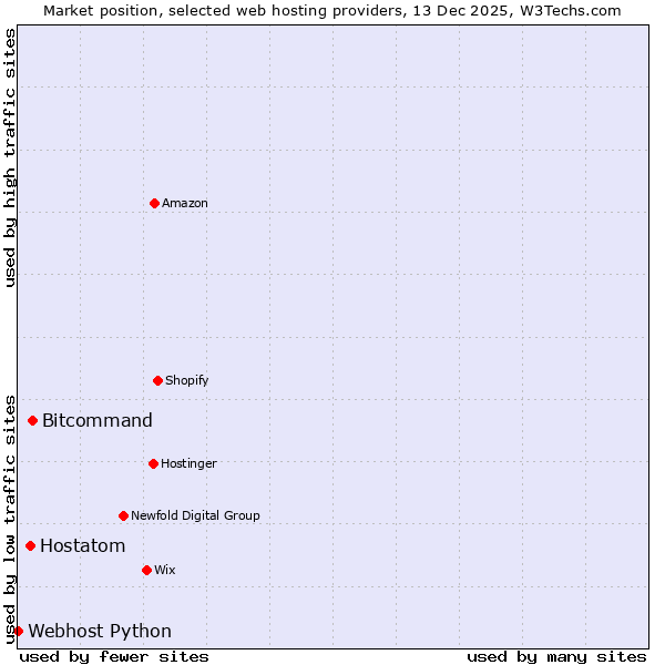 TechnologiesContent ManagementServer-side Languages Client-side Languages JavaScript Libraries CSS Frameworks Web Servers Web Panels Operating Systems Web Hosting Data Centers Reverse Proxies DNS Servers Email Servers SSL Certificate Authorities Content Delivery Traffic Analysis Tools Advertising Networks Tag Managers Social Widgets Site Elements Structured Data Markup Languages Character Encodings Image File Formats Top Level Domains Server Locations Content Languages | Technologies > Web Hosting > Technology usage comparison Comparison of the usage statistics of Bitcommand vs. Hostatom vs. Webhost Python for websitesThis report shows the usage statistics of Bitcommand vs. Hostatom vs. Webhost Python as web hosting provider on the web. See technologies overview for explanations on the methodologies used in the surveys. Our reports are updated daily. UsageThis diagram shows the percentages of websites using the selected technologies. How to read the diagram: