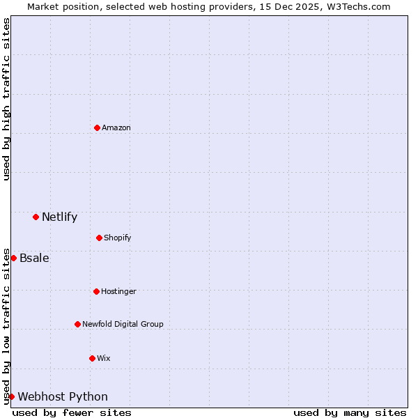 TechnologiesContent ManagementServer-side Languages Client-side Languages JavaScript Libraries CSS Frameworks Web Servers Web Panels Operating Systems Web Hosting Data Centers Reverse Proxies DNS Servers Email Servers SSL Certificate Authorities Content Delivery Traffic Analysis Tools Advertising Networks Tag Managers Social Widgets Site Elements Structured Data Markup Languages Character Encodings Image File Formats Top Level Domains Server Locations Content Languages | Technologies > Web Hosting > Technology usage comparison Comparison of the usage statistics of Netlify vs. Bsale vs. Webhost Python for websitesThis report shows the usage statistics of Netlify vs. Bsale vs. Webhost Python as web hosting provider on the web. See technologies overview for explanations on the methodologies used in the surveys. Our reports are updated daily. UsageThis diagram shows the percentages of websites using the selected technologies. How to read the diagram: