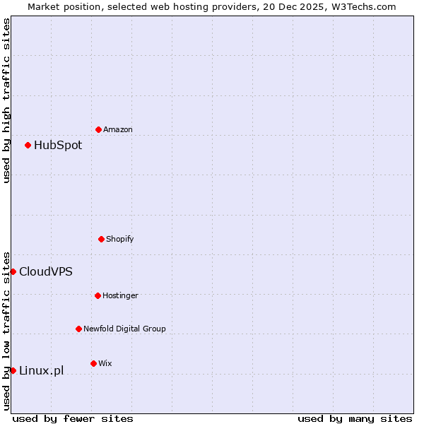 TechnologiesContent ManagementServer-side Languages Client-side Languages JavaScript Libraries CSS Frameworks Web Servers Web Panels Operating Systems Web Hosting Data Centers Reverse Proxies DNS Servers Email Servers SSL Certificate Authorities Content Delivery Traffic Analysis Tools Advertising Networks Tag Managers Social Widgets Site Elements Structured Data Markup Languages Character Encodings Image File Formats Top Level Domains Server Locations Content Languages | Technologies > Web Hosting > Technology usage comparison Comparison of the usage statistics of HubSpot vs. Linux.pl vs. CloudVPS for websitesThis report shows the usage statistics of HubSpot vs. Linux.pl vs. CloudVPS as web hosting provider on the web. See technologies overview for explanations on the methodologies used in the surveys. Our reports are updated daily. UsageThis diagram shows the percentages of websites using the selected technologies. How to read the diagram:
