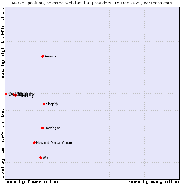 TechnologiesContent ManagementServer-side Languages Client-side Languages JavaScript Libraries CSS Frameworks Web Servers Web Panels Operating Systems Web Hosting Data Centers Reverse Proxies DNS Servers Email Servers SSL Certificate Authorities Content Delivery Traffic Analysis Tools Advertising Networks Tag Managers Social Widgets Site Elements Structured Data Markup Languages Character Encodings Image File Formats Top Level Domains Server Locations Content Languages | Technologies > Web Hosting > Technology usage comparison Comparison of the usage statistics of Netlify vs. GitHub vs. Dalnet for websitesThis report shows the usage statistics of Netlify vs. GitHub vs. Dalnet as web hosting provider on the web. See technologies overview for explanations on the methodologies used in the surveys. Our reports are updated daily. UsageThis diagram shows the percentages of websites using the selected technologies. How to read the diagram: