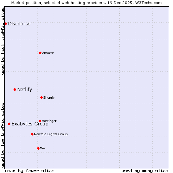 TechnologiesContent ManagementServer-side Languages Client-side Languages JavaScript Libraries CSS Frameworks Web Servers Web Panels Operating Systems Web Hosting Data Centers Reverse Proxies DNS Servers Email Servers SSL Certificate Authorities Content Delivery Traffic Analysis Tools Advertising Networks Tag Managers Social Widgets Site Elements Structured Data Markup Languages Character Encodings Image File Formats Top Level Domains Server Locations Content Languages | Technologies > Web Hosting > Technology usage comparison Comparison of the usage statistics of Netlify vs. Exabytes Group vs. Discourse for websitesThis report shows the usage statistics of Netlify vs. Exabytes Group vs. Discourse as web hosting provider on the web. See technologies overview for explanations on the methodologies used in the surveys. Our reports are updated daily. UsageThis diagram shows the percentages of websites using the selected technologies. How to read the diagram: