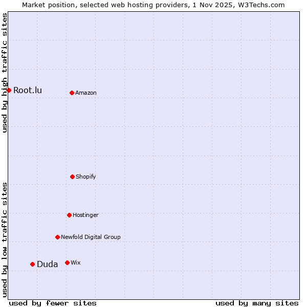 TechnologiesContent ManagementServer-side Languages Client-side Languages JavaScript Libraries CSS Frameworks Web Servers Web Panels Operating Systems Web Hosting Data Centers Reverse Proxies DNS Servers Email Servers SSL Certificate Authorities Content Delivery Traffic Analysis Tools Advertising Networks Tag Managers Social Widgets Site Elements Structured Data Markup Languages Character Encodings Image File Formats Top Level Domains Server Locations Content Languages ComparisonCompare with other | Technologies > Web Hosting > Technology usage comparison Comparison of the usage statistics of Duda vs. Root.lu for websitesThis report shows the usage statistics of Duda vs. Root.lu as web hosting provider on the web. See technologies overview for explanations on the methodologies used in the surveys. Our reports are updated daily. UsageThis diagram shows the percentages of websites using the selected technologies. How to read the diagram: