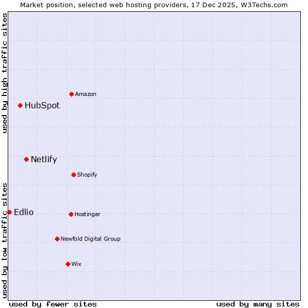 TechnologiesContent ManagementServer-side Languages Client-side Languages JavaScript Libraries CSS Frameworks Web Servers Web Panels Operating Systems Web Hosting Data Centers Reverse Proxies DNS Servers Email Servers SSL Certificate Authorities Content Delivery Traffic Analysis Tools Advertising Networks Tag Managers Social Widgets Site Elements Structured Data Markup Languages Character Encodings Image File Formats Top Level Domains Server Locations Content Languages | Technologies > Web Hosting > Technology usage comparison Comparison of the usage statistics of Netlify vs. HubSpot vs. Edlio for websitesThis report shows the usage statistics of Netlify vs. HubSpot vs. Edlio as web hosting provider on the web. See technologies overview for explanations on the methodologies used in the surveys. Our reports are updated daily. UsageThis diagram shows the percentages of websites using the selected technologies. How to read the diagram: