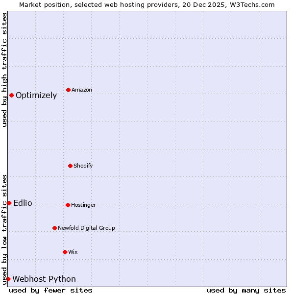 TechnologiesContent ManagementServer-side Languages Client-side Languages JavaScript Libraries CSS Frameworks Web Servers Web Panels Operating Systems Web Hosting Data Centers Reverse Proxies DNS Servers Email Servers SSL Certificate Authorities Content Delivery Traffic Analysis Tools Advertising Networks Tag Managers Social Widgets Site Elements Structured Data Markup Languages Character Encodings Image File Formats Top Level Domains Server Locations Content Languages | Technologies > Web Hosting > Technology usage comparison Comparison of the usage statistics of Optimizely vs. Edlio vs. Webhost Python for websitesThis report shows the usage statistics of Optimizely vs. Edlio vs. Webhost Python as web hosting provider on the web. See technologies overview for explanations on the methodologies used in the surveys. Our reports are updated daily. UsageThis diagram shows the percentages of websites using the selected technologies. How to read the diagram: