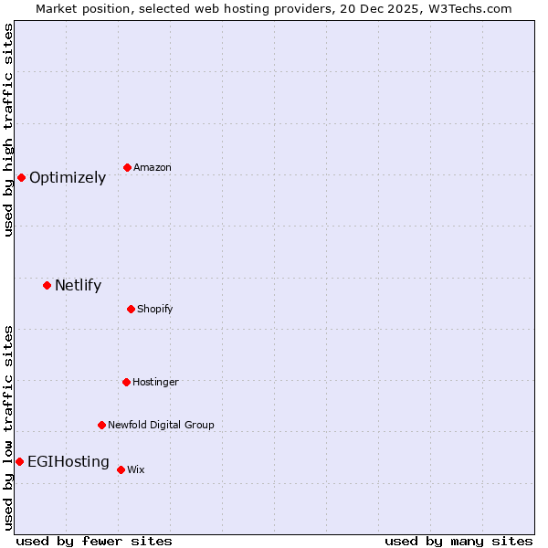 TechnologiesContent ManagementServer-side Languages Client-side Languages JavaScript Libraries CSS Frameworks Web Servers Web Panels Operating Systems Web Hosting Data Centers Reverse Proxies DNS Servers Email Servers SSL Certificate Authorities Content Delivery Traffic Analysis Tools Advertising Networks Tag Managers Social Widgets Site Elements Structured Data Markup Languages Character Encodings Image File Formats Top Level Domains Server Locations Content Languages | Technologies > Web Hosting > Technology usage comparison Comparison of the usage statistics of Netlify vs. Optimizely vs. EGIHosting for websitesThis report shows the usage statistics of Netlify vs. Optimizely vs. EGIHosting as web hosting provider on the web. See technologies overview for explanations on the methodologies used in the surveys. Our reports are updated daily. UsageThis diagram shows the percentages of websites using the selected technologies. How to read the diagram: