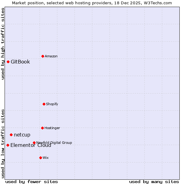 TechnologiesContent ManagementServer-side Languages Client-side Languages JavaScript Libraries CSS Frameworks Web Servers Web Panels Operating Systems Web Hosting Data Centers Reverse Proxies DNS Servers Email Servers SSL Certificate Authorities Content Delivery Traffic Analysis Tools Advertising Networks Tag Managers Social Widgets Site Elements Structured Data Markup Languages Character Encodings Image File Formats Top Level Domains Server Locations Content Languages | Technologies > Web Hosting > Technology usage comparison Comparison of the usage statistics of netcup vs. GitBook vs. Elementor Cloud for websitesThis report shows the usage statistics of netcup vs. GitBook vs. Elementor Cloud as web hosting provider on the web. See technologies overview for explanations on the methodologies used in the surveys. Our reports are updated daily. UsageThis diagram shows the percentages of websites using the selected technologies. How to read the diagram: