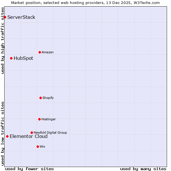 TechnologiesContent ManagementServer-side Languages Client-side Languages JavaScript Libraries CSS Frameworks Web Servers Web Panels Operating Systems Web Hosting Data Centers Reverse Proxies DNS Servers Email Servers SSL Certificate Authorities Content Delivery Traffic Analysis Tools Advertising Networks Tag Managers Social Widgets Site Elements Structured Data Markup Languages Character Encodings Image File Formats Top Level Domains Server Locations Content Languages | Technologies > Web Hosting > Technology usage comparison Comparison of the usage statistics of HubSpot vs. Elementor Cloud vs. ServerStack for websitesThis report shows the usage statistics of HubSpot vs. Elementor Cloud vs. ServerStack as web hosting provider on the web. See technologies overview for explanations on the methodologies used in the surveys. Our reports are updated daily. UsageThis diagram shows the percentages of websites using the selected technologies. How to read the diagram: