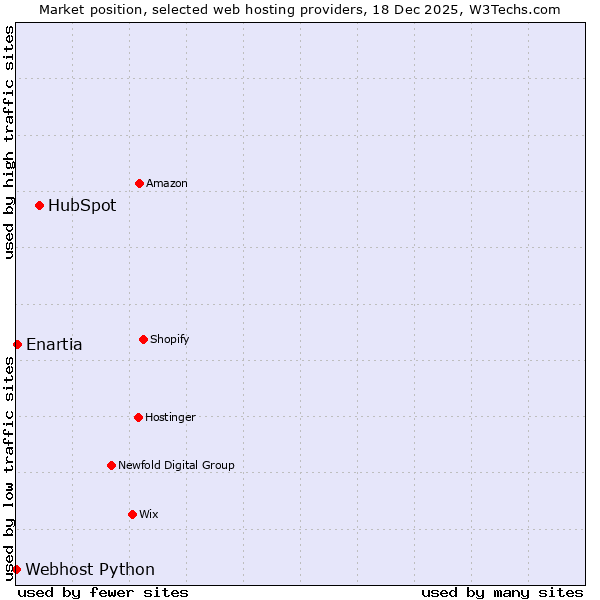 TechnologiesContent ManagementServer-side Languages Client-side Languages JavaScript Libraries CSS Frameworks Web Servers Web Panels Operating Systems Web Hosting Data Centers Reverse Proxies DNS Servers Email Servers SSL Certificate Authorities Content Delivery Traffic Analysis Tools Advertising Networks Tag Managers Social Widgets Site Elements Structured Data Markup Languages Character Encodings Image File Formats Top Level Domains Server Locations Content Languages | Technologies > Web Hosting > Technology usage comparison Comparison of the usage statistics of HubSpot vs. Enartia vs. Webhost Python for websitesThis report shows the usage statistics of HubSpot vs. Enartia vs. Webhost Python as web hosting provider on the web. See technologies overview for explanations on the methodologies used in the surveys. Our reports are updated daily. UsageThis diagram shows the percentages of websites using the selected technologies. How to read the diagram: