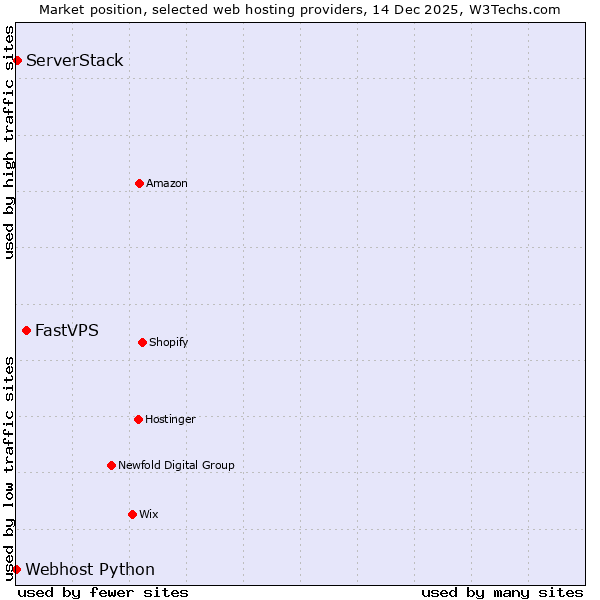 TechnologiesContent ManagementServer-side Languages Client-side Languages JavaScript Libraries CSS Frameworks Web Servers Web Panels Operating Systems Web Hosting Data Centers Reverse Proxies DNS Servers Email Servers SSL Certificate Authorities Content Delivery Traffic Analysis Tools Advertising Networks Tag Managers Social Widgets Site Elements Structured Data Markup Languages Character Encodings Image File Formats Top Level Domains Server Locations Content Languages | Technologies > Web Hosting > Technology usage comparison Comparison of the usage statistics of FastVPS vs. ServerStack vs. Webhost Python for websitesThis report shows the usage statistics of FastVPS vs. ServerStack vs. Webhost Python as web hosting provider on the web. See technologies overview for explanations on the methodologies used in the surveys. Our reports are updated daily. UsageThis diagram shows the percentages of websites using the selected technologies. How to read the diagram: