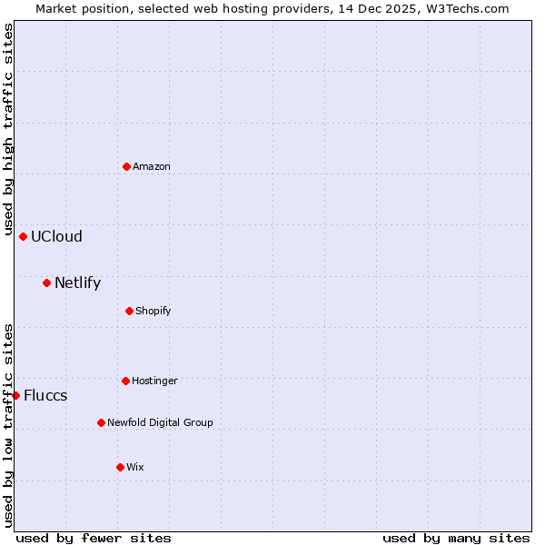 TechnologiesContent ManagementServer-side Languages Client-side Languages JavaScript Libraries CSS Frameworks Web Servers Web Panels Operating Systems Web Hosting Data Centers Reverse Proxies DNS Servers Email Servers SSL Certificate Authorities Content Delivery Traffic Analysis Tools Advertising Networks Tag Managers Social Widgets Site Elements Structured Data Markup Languages Character Encodings Image File Formats Top Level Domains Server Locations Content Languages | Technologies > Web Hosting > Technology usage comparison Comparison of the usage statistics of Netlify vs. UCloud vs. Fluccs for websitesThis report shows the usage statistics of Netlify vs. UCloud vs. Fluccs as web hosting provider on the web. See technologies overview for explanations on the methodologies used in the surveys. Our reports are updated daily. UsageThis diagram shows the percentages of websites using the selected technologies. How to read the diagram: