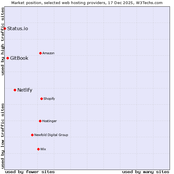 TechnologiesContent ManagementServer-side Languages Client-side Languages JavaScript Libraries CSS Frameworks Web Servers Web Panels Operating Systems Web Hosting Data Centers Reverse Proxies DNS Servers Email Servers SSL Certificate Authorities Content Delivery Traffic Analysis Tools Advertising Networks Tag Managers Social Widgets Site Elements Structured Data Markup Languages Character Encodings Image File Formats Top Level Domains Server Locations Content Languages | Technologies > Web Hosting > Technology usage comparison Comparison of the usage statistics of Netlify vs. GitBook vs. Status.io for websitesThis report shows the usage statistics of Netlify vs. GitBook vs. Status.io as web hosting provider on the web. See technologies overview for explanations on the methodologies used in the surveys. Our reports are updated daily. UsageThis diagram shows the percentages of websites using the selected technologies. How to read the diagram: