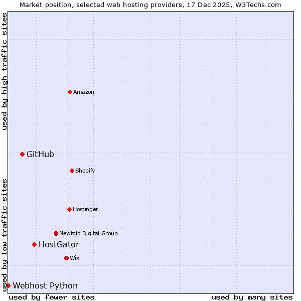 TechnologiesContent ManagementServer-side Languages Client-side Languages JavaScript Libraries CSS Frameworks Web Servers Web Panels Operating Systems Web Hosting Data Centers Reverse Proxies DNS Servers Email Servers SSL Certificate Authorities Content Delivery Traffic Analysis Tools Advertising Networks Tag Managers Social Widgets Site Elements Structured Data Markup Languages Character Encodings Image File Formats Top Level Domains Server Locations Content Languages | Technologies > Web Hosting > Technology usage comparison Comparison of the usage statistics of HostGator vs. GitHub vs. Webhost Python for websitesThis report shows the usage statistics of HostGator vs. GitHub vs. Webhost Python as web hosting provider on the web. See technologies overview for explanations on the methodologies used in the surveys. Our reports are updated daily. UsageThis diagram shows the percentages of websites using the selected technologies. How to read the diagram: