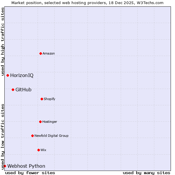 TechnologiesContent ManagementServer-side Languages Client-side Languages JavaScript Libraries CSS Frameworks Web Servers Web Panels Operating Systems Web Hosting Data Centers Reverse Proxies DNS Servers Email Servers SSL Certificate Authorities Content Delivery Traffic Analysis Tools Advertising Networks Tag Managers Social Widgets Site Elements Structured Data Markup Languages Character Encodings Image File Formats Top Level Domains Server Locations Content Languages | Technologies > Web Hosting > Technology usage comparison Comparison of the usage statistics of GitHub vs. HorizonIQ vs. Webhost Python for websitesThis report shows the usage statistics of GitHub vs. HorizonIQ vs. Webhost Python as web hosting provider on the web. See technologies overview for explanations on the methodologies used in the surveys. Our reports are updated daily. UsageThis diagram shows the percentages of websites using the selected technologies. How to read the diagram: