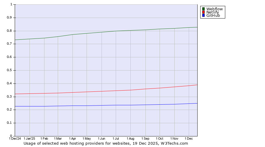TechnologiesContent ManagementServer-side Languages Client-side Languages JavaScript Libraries CSS Frameworks Web Servers Web Panels Operating Systems Web Hosting Data Centers Reverse Proxies DNS Servers Email Servers SSL Certificate Authorities Content Delivery Traffic Analysis Tools Advertising Networks Tag Managers Social Widgets Site Elements Structured Data Markup Languages Character Encodings Image File Formats Top Level Domains Server Locations Content Languages | Technologies > Web Hosting > Technology usage comparison Comparison of the usage statistics of Webflow vs. Netlify vs. GitHub for websitesThis report shows the usage statistics of Webflow vs. Netlify vs. GitHub as web hosting provider on the web. See technologies overview for explanations on the methodologies used in the surveys. Our reports are updated daily. UsageThis diagram shows the percentages of websites using the selected technologies. How to read the diagram: