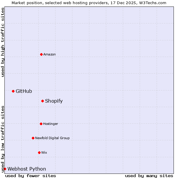 TechnologiesContent ManagementServer-side Languages Client-side Languages JavaScript Libraries CSS Frameworks Web Servers Web Panels Operating Systems Web Hosting Data Centers Reverse Proxies DNS Servers Email Servers SSL Certificate Authorities Content Delivery Traffic Analysis Tools Advertising Networks Tag Managers Social Widgets Site Elements Structured Data Markup Languages Character Encodings Image File Formats Top Level Domains Server Locations Content Languages | Technologies > Web Hosting > Technology usage comparison Comparison of the usage statistics of Shopify vs. GitHub vs. Webhost Python for websitesThis report shows the usage statistics of Shopify vs. GitHub vs. Webhost Python as web hosting provider on the web. See technologies overview for explanations on the methodologies used in the surveys. Our reports are updated daily. UsageThis diagram shows the percentages of websites using the selected technologies. How to read the diagram: